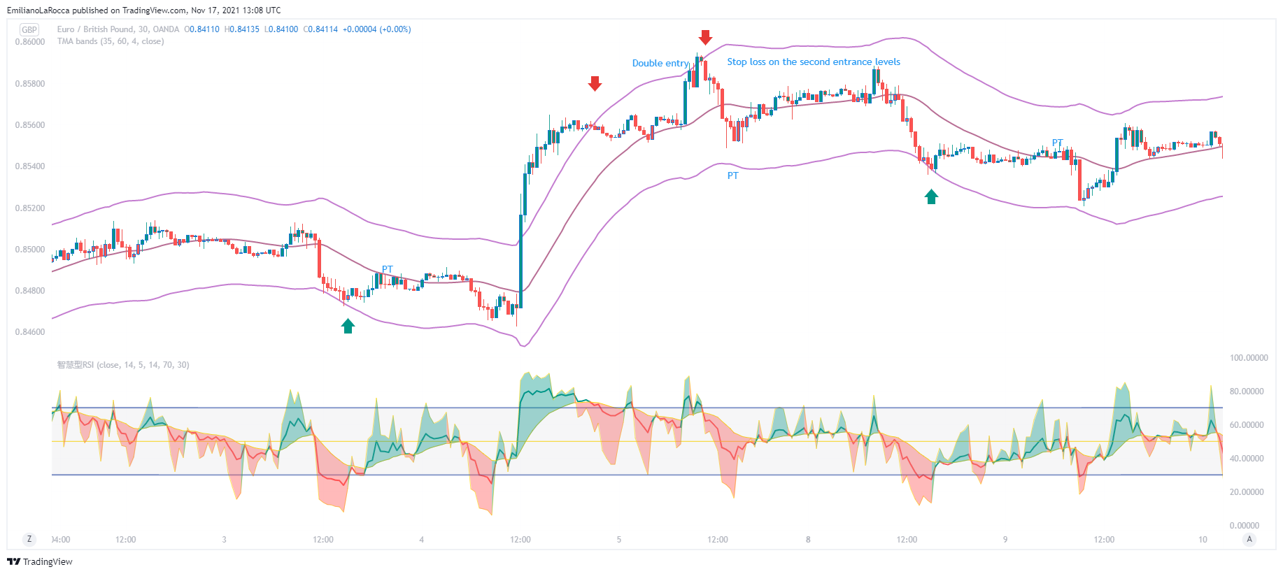 The price exits the upper TMAs, accompanied by RSI crossing above 70. Upon RSI retracement below 70 and the line turning red, initiate a sell trade.